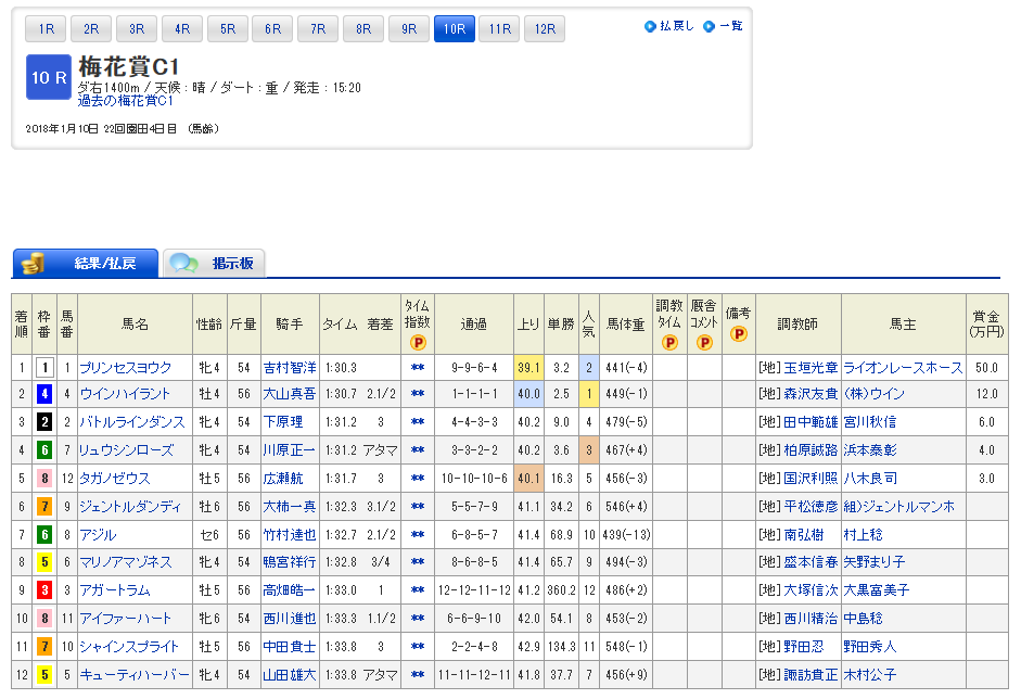 プリンセスヨウク号が出走する梅花賞は10Rです。