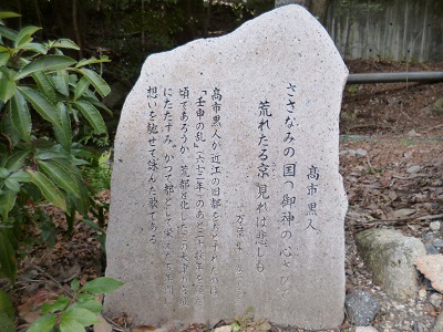 | 高市古人の近江の旧堵を感傷して作れる歌 [或る書に云はく、高市連黒人といへり] 楽浪(ささなみ)の 国つ御神(みかみ)の うらさびて 荒れたる京(みやこ) 見れば悲しも |