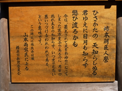 | 高市皇子尊(たけちのみこのみこと)の城上(きのへ)の殯宮(あらきのみや)の時に、柿本朝臣人麿の作れる短歌 ひさかたの 天(あめ)知らしぬる 君ゆゑに 日月(ひつき)も知らに 恋ひ渡るかも |