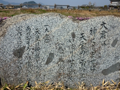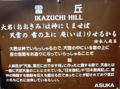 雷丘は、高市郡明日香村大字雷にある標高110mほどの丘。 遠くに見える山は畝傍山です。 柿本人麻呂は、飛鳥時代の歌人。 後世、山部赤人とともに歌聖と呼ばれ、称えられている。 また三十六歌仙の一人で、平安時代からは「人丸」と表記されることが多い。 経歴は「続日本紀」等の史書にも書かれていないことから定かではなく、万葉集の詠歌とそれに附随する題詞・左注などが唯一の資料である。 一般には天武天皇9年(680年)には出仕していたとみられ、 天武朝から歌人としての活動をはじめ、持統朝に花開いたとみられることが多い。 ただし、近江朝に仕えた宮女の死を悼む挽歌を詠んでいることから、近江朝にも出仕していたとする見解もある。 賀茂真淵によって草壁皇子に舎人として仕えたとされ、この見解は支持されることも多いが、決定的な根拠があるわけではない。 複数の皇子・皇女(弓削皇子・舎人親王・新田部親王など)に歌を奉っているので、特定の皇子に仕えていたのではないだろうとも思われる。 近時は宮廷歌人であったと目されることが多いが、 宮廷歌人という職掌が持統朝にあったわけではなく、結局は不明というほかない。 ただし、確実に年代の判明している人麻呂の歌は持統天皇の即位からその崩御にほぼ重なっており、 この女帝の存在が人麻呂の活動の原動力であったとみるのは不当ではないと思われる。 万葉集巻2に讃岐で死人を嘆く歌が残り、 また石見国は鴨山での辞世歌と、彼の死を哀悼する挽歌が残されているため、 官人となって各地を転々とし最後に石見国で亡くなったとみられることも多いが、 この辞世歌については、人麻呂が自身の死を演じた歌謡劇であるとの理解や、 後人の仮託であるとの見解も有力である。 また、文武天皇4年(700年)に薨去した明日香皇女への挽歌が残されていることからみて、 草壁皇子の薨去後も都にとどまっていたことは間違いない。 藤原京時代の後半や、平城京遷都後の確実な作品が残らないことから、平城京遷都前には死去したものと思われる。 |