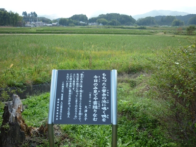 | 大津皇子(おほつのみこ)の被死(みまか)らしめらえし時に、 磐余(いはれ)の池の般(つつみ)にして涙(なみだ)を流して作りませる御歌一首 ももづたふ 磐余(いわれ)の池に 鳴く鴨を 今日のみ見てや 雲隠(かく)りなむ |