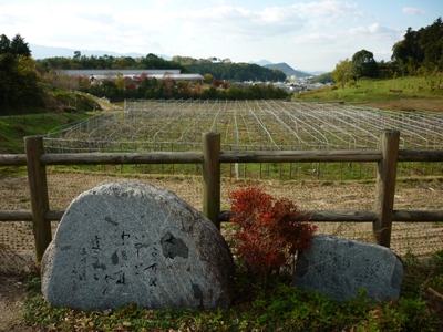 県立万葉文化館へ入る交差点の内側にあります。 向こうに見えているのは畝傍山。 |