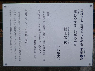 薩摩川内市の歴史資料館の裏手の川筋に15基の万葉歌碑が建っており、そのうちのひとつです。 朱華(はねず)とは、庭梅のこと。染色があせやすい。 |