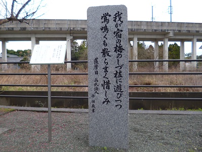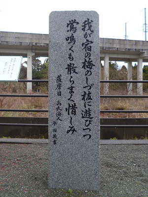 薩摩川内市の歴史資料館の裏手の川筋に15基の万葉歌碑が建っており、そのうちのひとつです。 鶯は警戒心の強い鳥だから実際には姿は見えなかっただろうと思われますが、 その鳴き声から梅の上枝に止ると花が散ってしまうから、下枝に止まって鳴いているのだろうと考えたのでしょう。 優美な歌です。 |