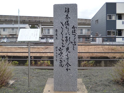 薩摩川内市の歴史資料館の裏手の川筋に15基の万葉歌碑が建っており、そのうちのひとつです。 |