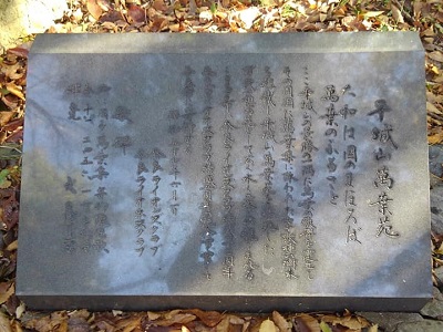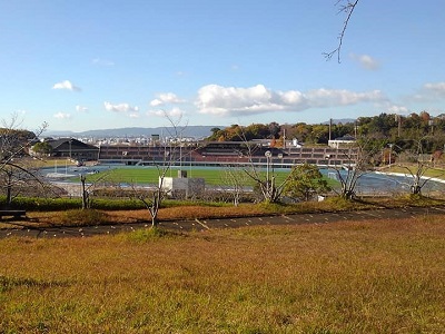 万葉の黒髪山は佐保山の一部であり、奈良阪町から法蓮町にかけての地です。 歌碑は現在、鴻ノ池陸上競技場の東側の万葉苑の径におかれています。 鴻ノ池陸上競技場がよく見えます。 |