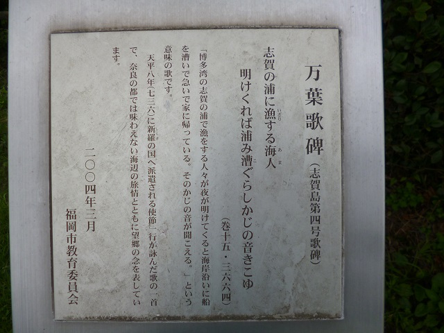 志賀島第4号万葉歌碑。 潮見台展望台から福岡タワーやヤフードームがうっすらと見えました。 |