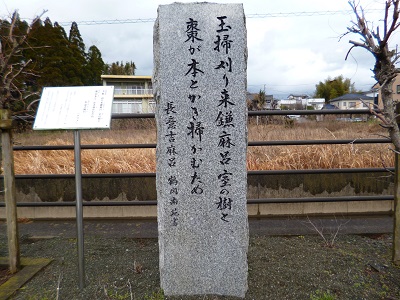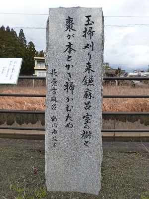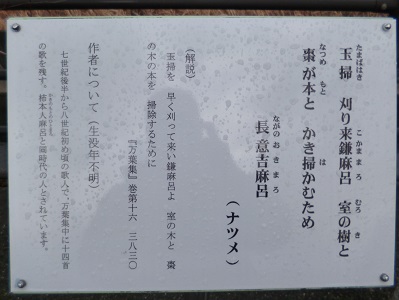 薩摩川内市の歴史資料館の裏手の川筋に15基の万葉歌碑が建っており、そのうちのひとつです。 宴席で戯れに詠んだ歌。 「玉掃(たまばはき)」は、キク科の高野箒(こうやぼうき)のことで、これで儀式(ぎしき)などに使う箒(ほうき)を作った。 |