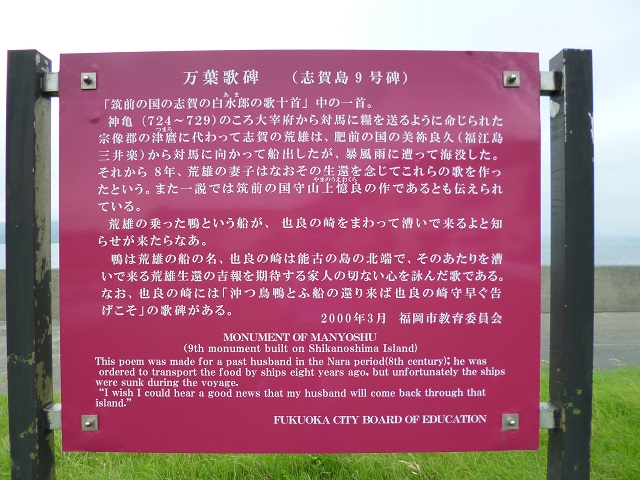 志賀島第9号万葉歌碑。 志賀島南西部の棚ヶ浜に建てられている。 奈良時代に、大宰府が対馬に食料を送る船の舵取りとなった宗形部津麻呂に代わって出航し、 途中の暴風雨により帰らぬ人となった志賀の荒雄にまつわる歌であり、 荒雄を失った妻子の心の痛みを山上憶良が詠んだとも伝えられる。 荒雄の帰還に一縷の望みをたくす家族にとって、荒雄の生還はかなわない事を意味している。 |