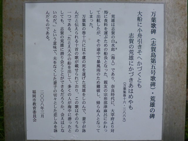志賀島第5号万葉歌碑。 五島から対馬までの食糧運搬の難役を買って出た海人の荒雄が、暴風で遭難したという伝説に基づく歌です。 |