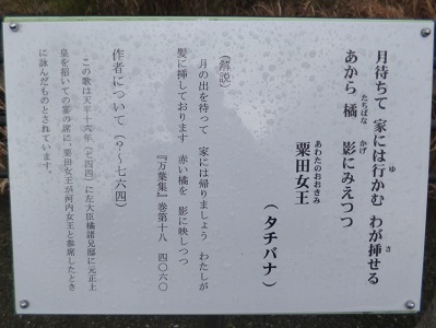 粟田女王の歌 月待ちて 家には行かむ 我が插せる あから橘 影に見えつつ 右の件(くだり)の歌は、左大臣橘卿の宅に在(いま)して 肆宴(とよのあかり)きこしめしし時の御歌なり。并せて奏れる歌。 |