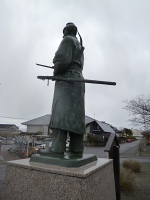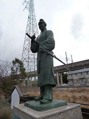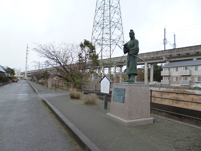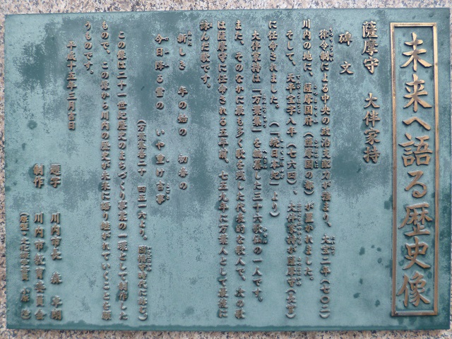 薩摩川内市の歴史資料館の裏手の川筋に15基の万葉歌碑が建っており、そのなかに大伴家持の銅像があります。 この像は、21世紀歴史のまちづくり事業の一環として制作したものであると刻まれています。 平成15年3月建立。川内市長・森卓朗とあります。 (15基の歌碑は2000年希望ワーク事業として、平成12年度から14年度にかけて2千5百億円かけて整備されたそうです) |