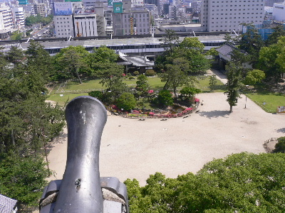 天守閣からスタート地点を見下ろす。駅も見えてるわな。