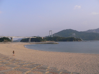 17時44分、リタイアの地より伯方大島大橋を望む。すでに夕方のビーチ。