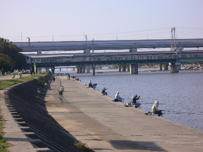 みなさんハゼ釣り。向こうは阪神武庫川駅