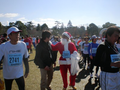 しまいがた、颯爽と走る女性サンタさんと一緒になり、ゴールも一緒でした。