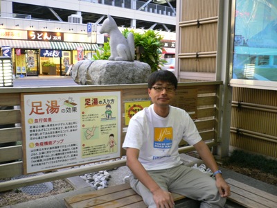 観光案内所前の足湯。熱い熱い。飲泉もありマス。