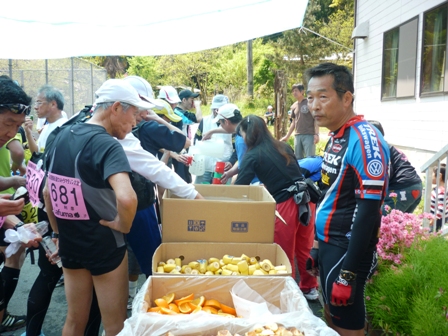 今回は、エイドに着くとまず梅干をかじり、お茶をのんで、オレンジで元気出して出発というパターンを心がけました。
