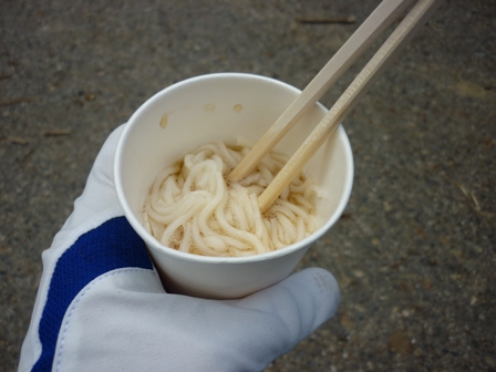 ここのエイドは豆腐ソーメンで有名です。2つもらいました。