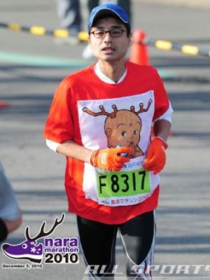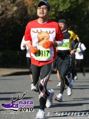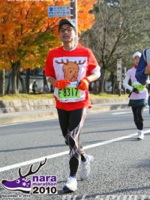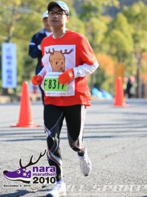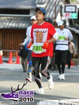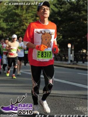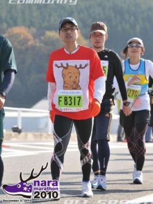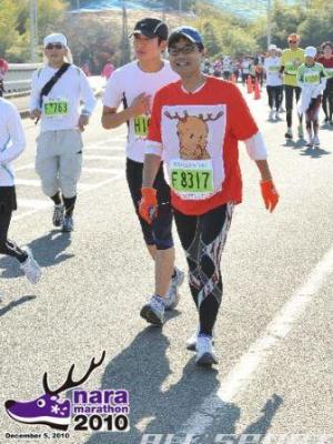 最後の坂を上っていると、せんとくんを背負って走っている人を見つけました。