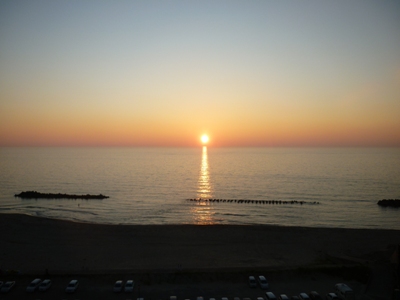 部屋からの景色。めちゃめちゃ夏の浜辺(6:46)