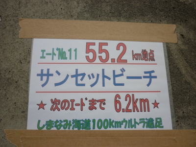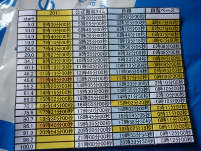 | N0. | 距離 (km) | 区間 距離 (km) | エイド設置場所 | エイド 撤収 時刻 (公式) | 2005 到達 時刻 | 2011 到達 時刻 | 2012 到達 時刻 | 所要 時間 (分) | sec./km |