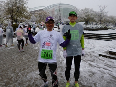 雪が雨に変わり、五輪大橋のハーフ地点では