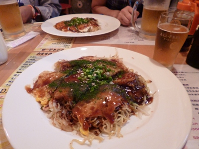 広島風お好み焼き。自分はノンアルコールビール。
