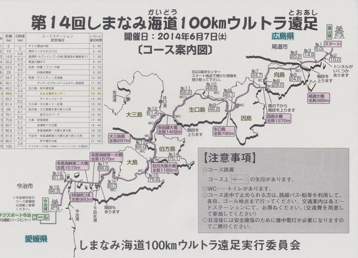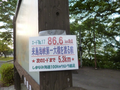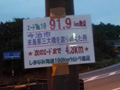| 18 | 91.9 | 5.3 | 来島第3大橋を渡りおえた所 | 20:20 | 20:54 | 20:27 | 19:35 | 60 | 13:12 | ||