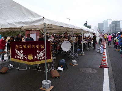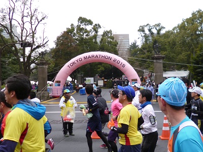 正面玄関前の位置には東京マラソンスタート地点のしるしがあります