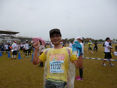 かばんを背負ったうえからポンチョをかぶって徒歩にて会場入りしました。