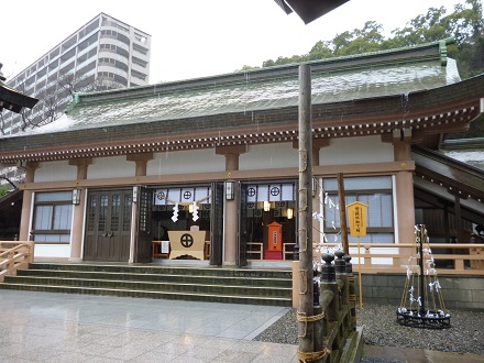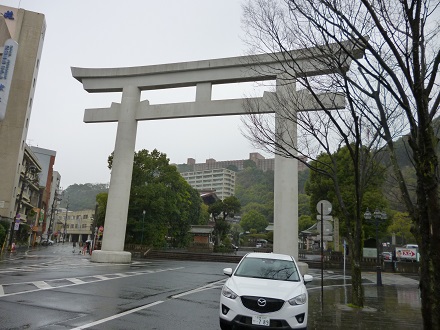 鳥居の向こうに、数年前に妻と泊まった城山観光ホテルが見えます。