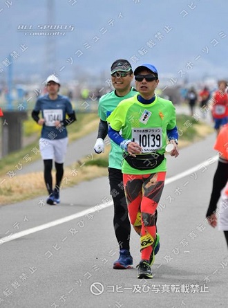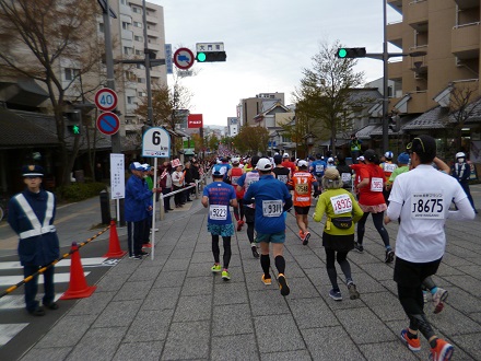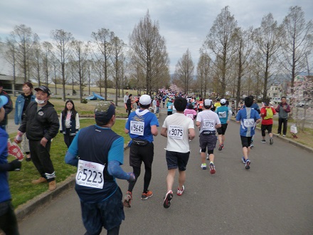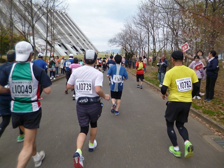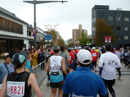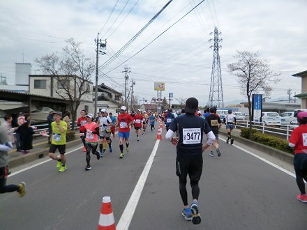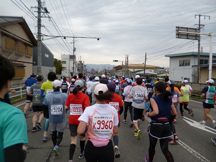 14キロ過ぎ、エムウェーブからの折り返しランナーと対向します
