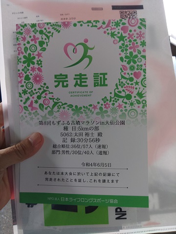 ほんとに久しぶりのリアル完走証。こんなにはやかったっけ?