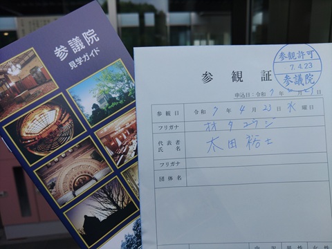 参議院では親切に「建物の中に入って参観申込書を書いていてください。受付は13時45分からです。」と、