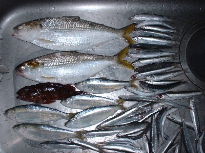 結局のべ竿状態でどっさりのカタクチイワシとそれにまぎれたアジをゲットするとは。。。