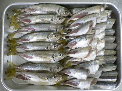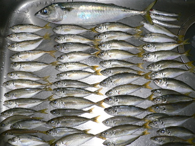 本日の成果。30cmサバ1、小アジ55、ウルメイワシ3。