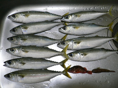本日の成果。プリプリの25cmゴマサバ10匹。ちびハゼ。ミニガッシー。