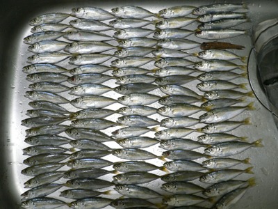 本日の成果。豆あじ94、イワシ4、ハゼ1