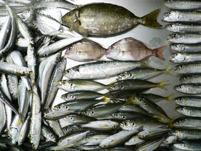 本日の成果。このうちチャリコとイワシ30匹を師匠に献上。