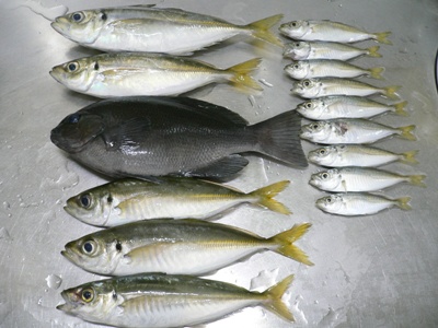 本日の成果。20cmグレ、アジ、豆アジ。刺身と南蛮漬けがおいしゅうございました。