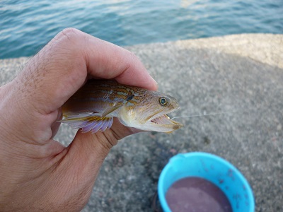 あきらめかけていた頃に、カゴの先から垂らしていた仕掛けにエソのちっさいのがついてきました。